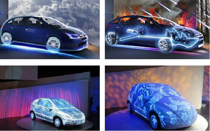裸眼3D(汽車),根據活動主題,設計影像內容對汽車進行投影,依據汽車已有的外表結構,經過精確計算的距離數據。利用圖像編程系統,通過影像控制系統對投射出的影像進行視覺演繹。